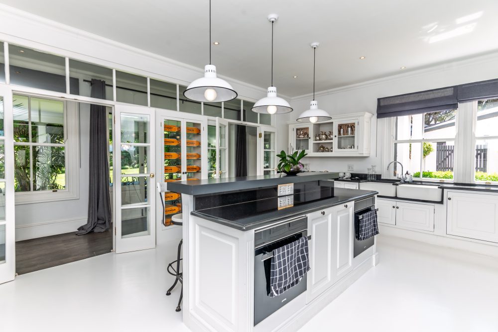 A family TV lounge with fireplace connects to the pool pavilion, while a fitted home office offers a tranquil work-from-home space. The classic black-and-white kitchen includes bespoke cabinetry, glass display cupboards, double integrated fridge/freezer, two porcelain basins, breakfast counter, two Smeg undercounter ovens and a five-plate Smeg induction hob. An interleading scullery, separate laundry and ironing room and separate charming breakfast room ensure practicality.
