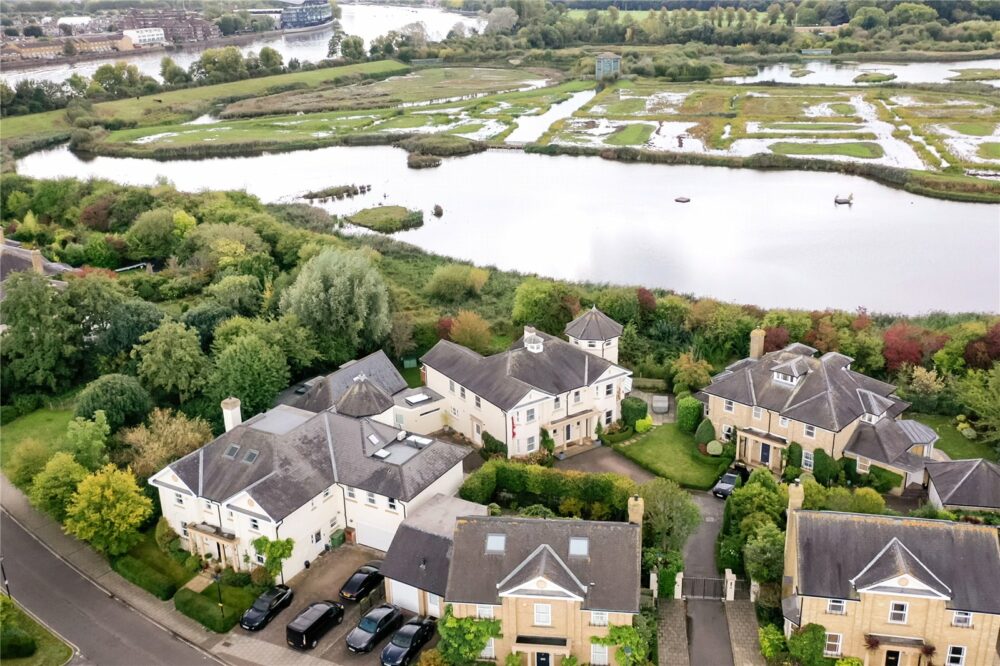 Upstairs, on the first floor is a superb principal bedroom suite with full height glass doors leading out to a large balcony overlooking the garden and the Wetlands beyond. The principal bedroom’s luxurious en suite bathroom room features a walk-in shower, along with a separate bathtub and Mr and Mrs sinks. There are an additional five double bedrooms and four bathrooms, two of which are en suite. A staircase leads on up to a wonderful observation tower with fantastic views and can be used as a flexible living space.