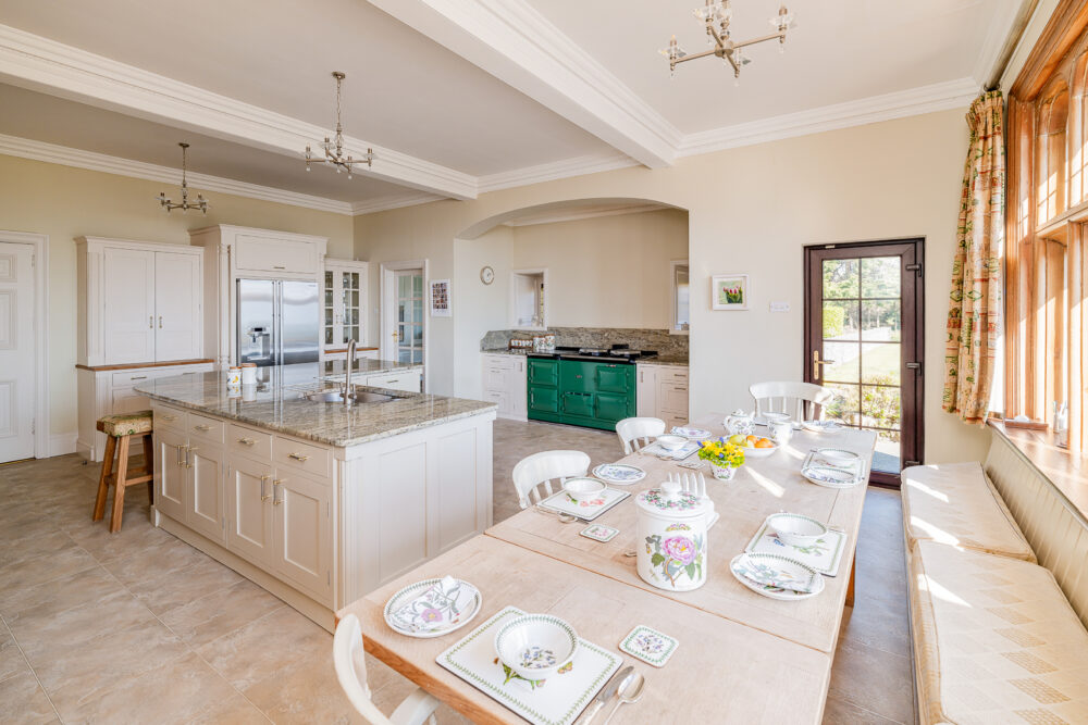 A further reception room opens via French doors to the landscaped side garden, while the elegant dining room incorporates a shelved study area and a feature fireplace with wood burner. A rear hall leads to a utility room with access to the courtyard. The generously proportioned kitchen/breakfast room is beautifully appointed with a comprehensive range of wall and base units, a large L-shaped central island with breakfast bar, an Aga, and bespoke built-in seating. A door from the kitchen dining area provides direct access to the gardens.