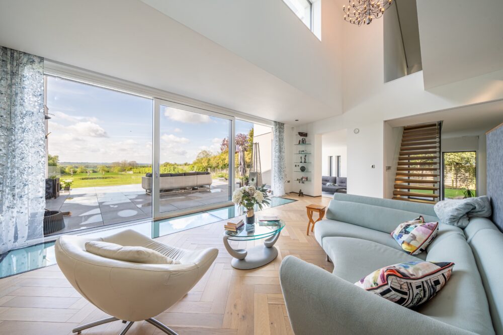 Sustainability is at the core of the home’s design, earning it an A- rated energy performance certificate. A ground source heat pump, solar panels and triple glazed aluminium windows ensure energy efficiency and comfort. The property also features an advanced heat recovery system, and 3×10,000 litre water harvester.