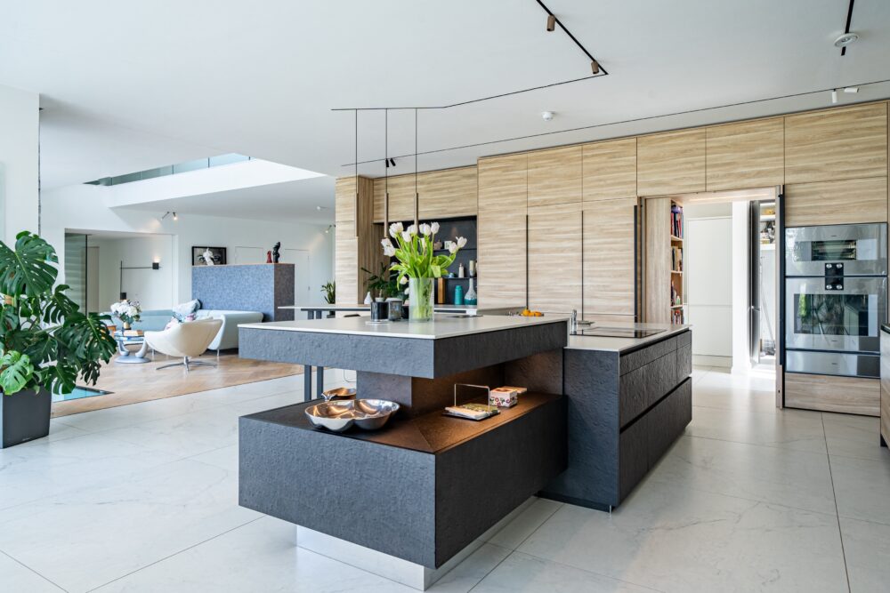 The heart of the property is an expansive open-plan kitchen/dining and living area filled with natural light. The bespoke German kitchen by Stephen Christopher, includes a breakfast larder with concealed doors, Gaggenau appliances, Bora hob, Liebher fridges and dishwasher, a kettle tap and an additional pantry with additional appliances. Full height sliding doors open onto a generous balcony, blurring the line between indoor and outdoor living. There are also loudspeakers hidden within the walls.
