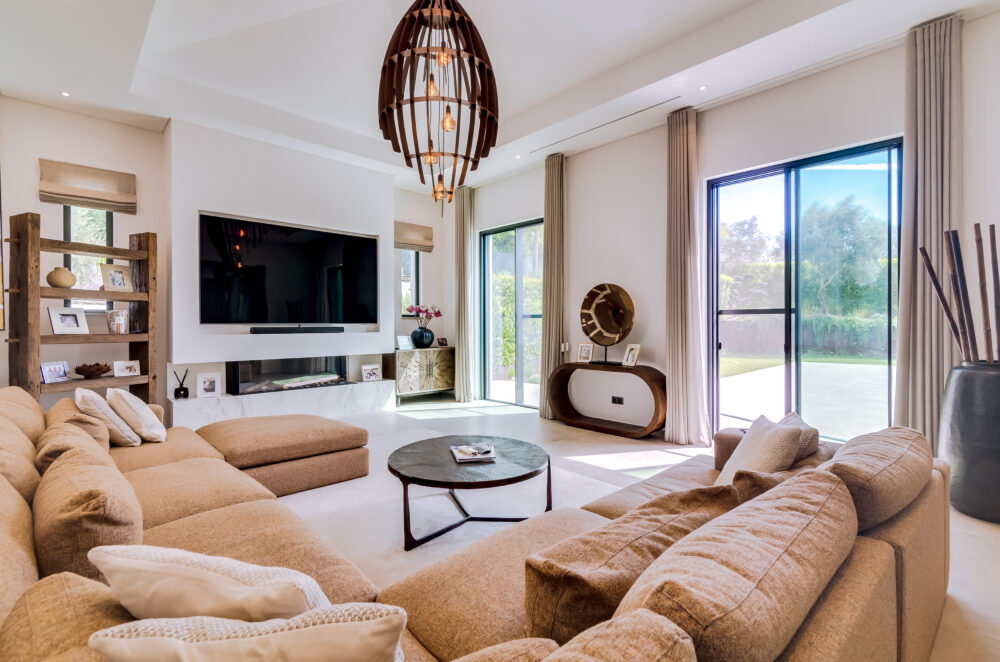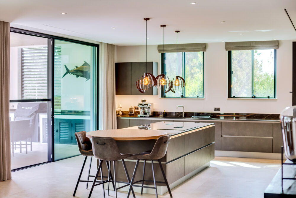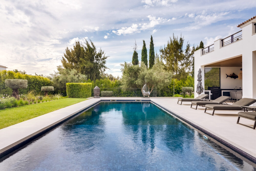 This contemporary villa combines comfort and style, offering a luxurious open-plan layout that connects the kitchen, dining, and living areas. The kitchen is fitted with high-end appliances and a large island. Floor-to-ceiling windows and doors open to the patio, filling the interiors with natural light while creating an indoor-outdoor living experience. This level also features a one-bedroom suite and a guest bathroom.Upstairs, there are three-bedroom suites, including a spacious master suite featuring a free-standing tub. High ceilings throughout enhance the sense of space and light. A two-car garage with interior access adds convenience.The exterior spaces are equally appealing, where a swimming pool is framed by generous lounging areas ideal for relaxing or entertaining outdoors. Minutes from Vilamoura, Quinta do Lago, and Vale do Lobo, the villa offers modern living and access to the Algarve’s finest amenities.