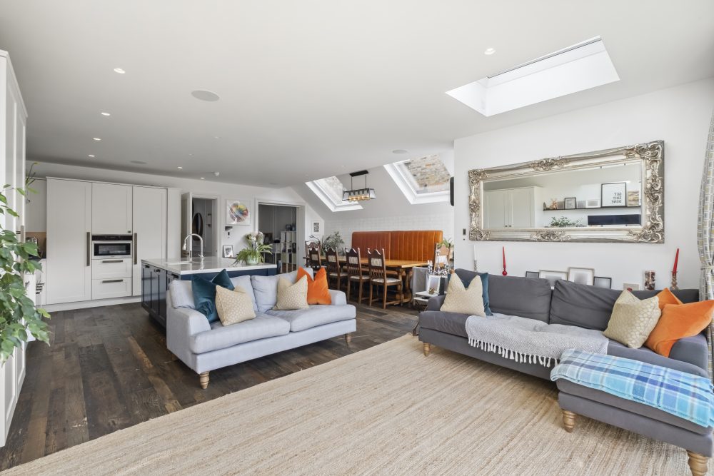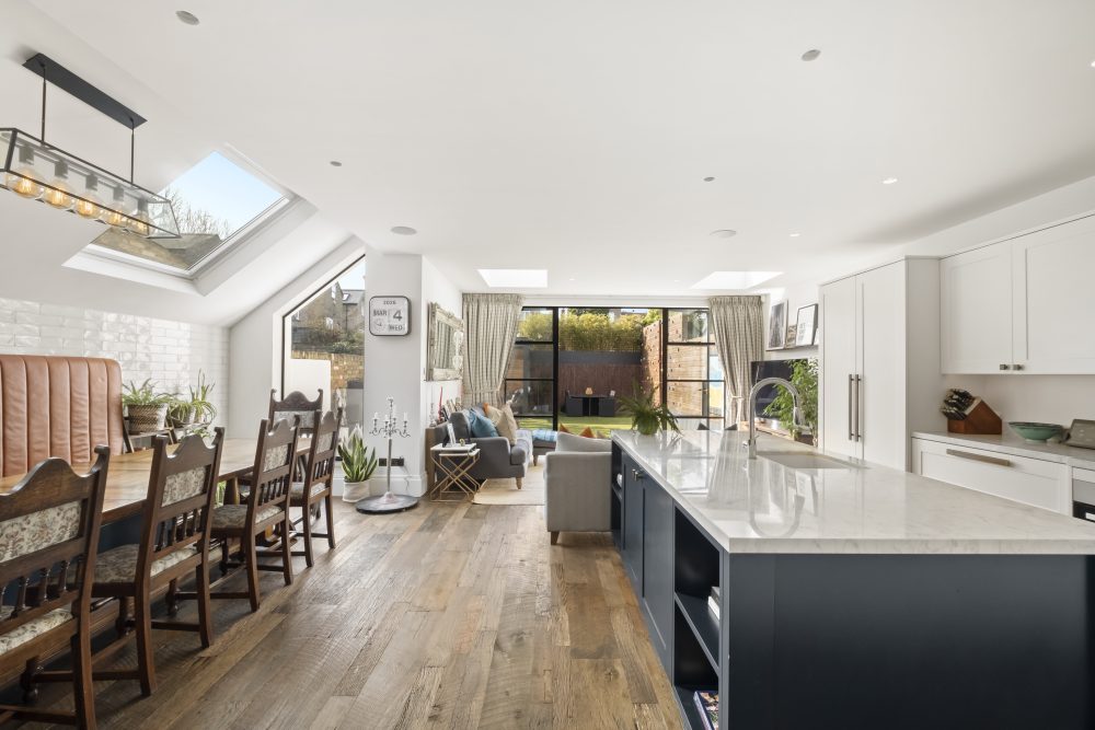 Two elegant reception rooms set the tone for both quiet evenings and lively gatherings. To the rear, the spectacular kitchen, dining and family space opens through wide bi-fold doors onto the west-facing open aspect garden, a sunlit connection of the living area perfect for relaxed breakfasts, after school play or al fresco dinners that stretch into warm summer evenings.