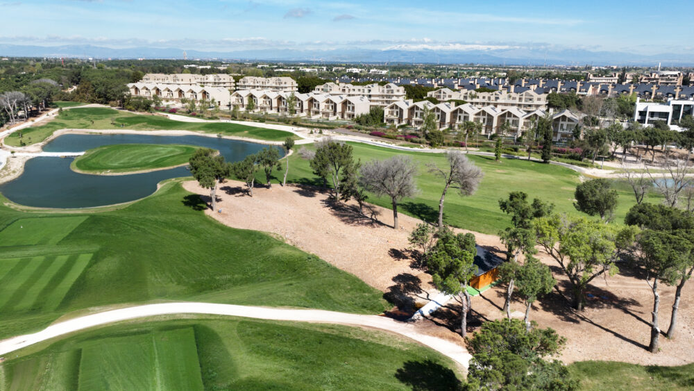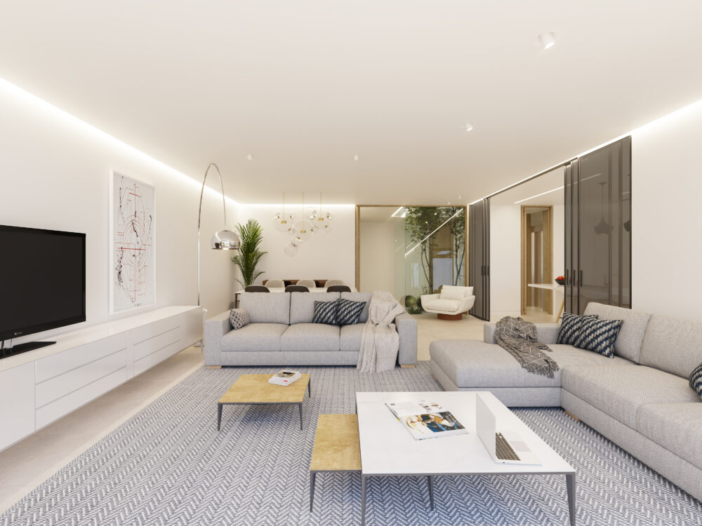 On the ground floor, the home is organized around a landscaped patio that brings light and privacy to every space. The spacious south-facing living room opens onto the private garden, offering a direct connection to the golf course views.