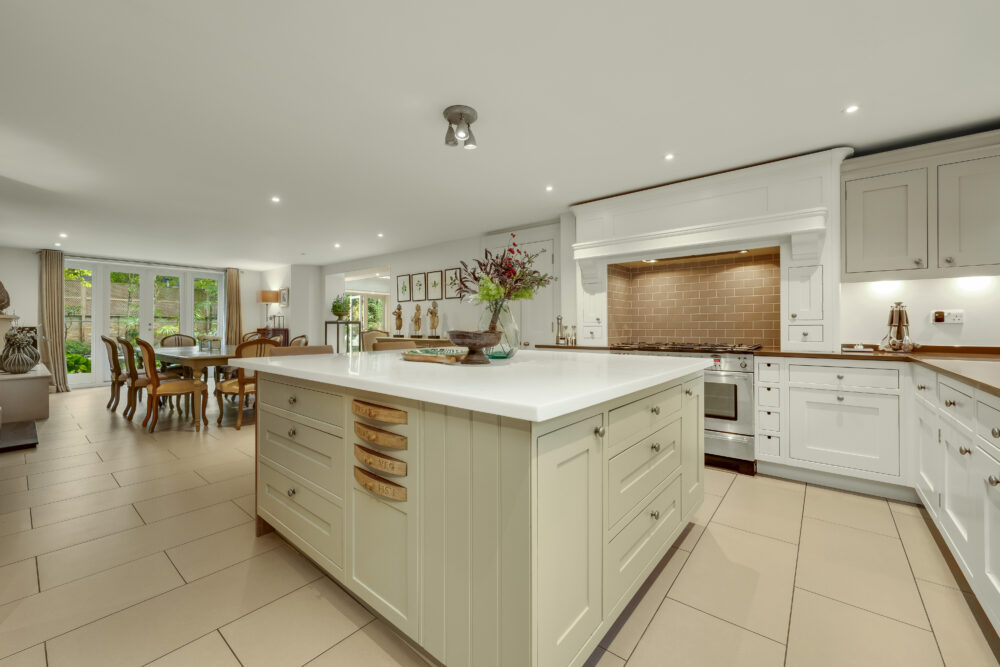 This stylish farmhouse-style kitchen features crisp white cabinetry with warm mocha Corian worktops, complemented by a central island with sage green units and contrasting white Corian surfaces. A butler sink and integrated Rangemaster oven add to the appeal and functionality. Flowing seamlessly from the kitchen, the spacious dining area is centred around an elegant feature fireplace, with bespoke fitted storage to one side and ample space for a large table perfect for hosting. Double doors open directly onto the rear garden, creating a wonderful indoor/outdoor flow in the warmer months.