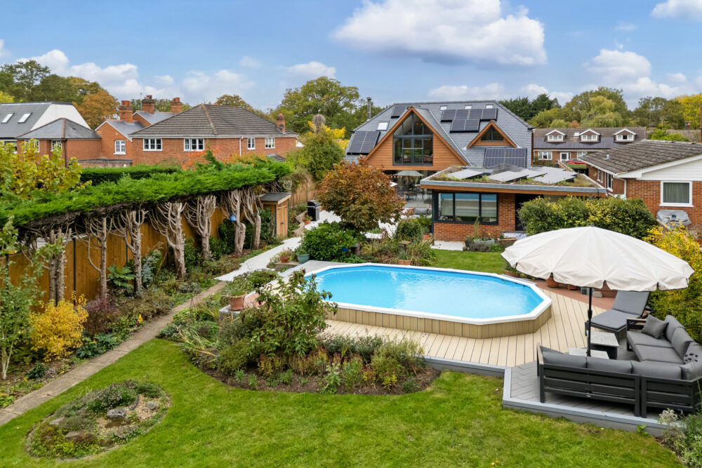 The property is approached via electric gates with a gravelled driveway with parking for a number of vehicles. There is a selection of outbuildings including a private gym and a separate office/annexe, ideal for remote working. A covered area adjacent to the garage offers further sheltered space for storage. The gardens are a true highlight. Mature trees and vibrant planting frame a well-maintained lawn, leading to a central swimming pool surrounded by paved pathways and seating areas. This tranquil outdoor setting is perfect for relaxing or entertaining. This is a rare opportunity to acquire a sustainable home in a sought after location.
