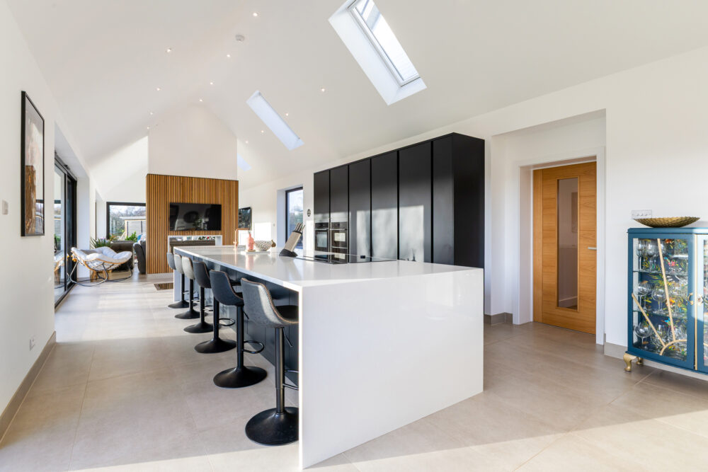 The centrepiece of the house is a magnificent kitchen, dining and family space, conceived as both a statement space and the natural hub of the home. Designed for effortless entertaining as well as everyday living, it is supported by a pantry, utility room and boot/laundry room, allowing the principal areas to remain calm, refined and uncluttered. The kitchen features a sociable central island, double ovens, a range of high quality built in appliances and a magnificent sunken wine cellar. A sequence of reception rooms enhances the sense of versatility and includes a generous sitting room a dedicated cinema room, a study and a gymnasium or additional bedroom.