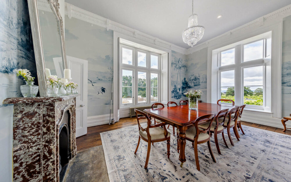 Off the Grand Entrance Hall is the Sitting Room with log burning stove with original Rose Marble Surround. This room is full of light and original features, including a stunning 3m high sliding pocket door leading into the Dining Room with an incredible 360degree wall mural and views across the grounds
