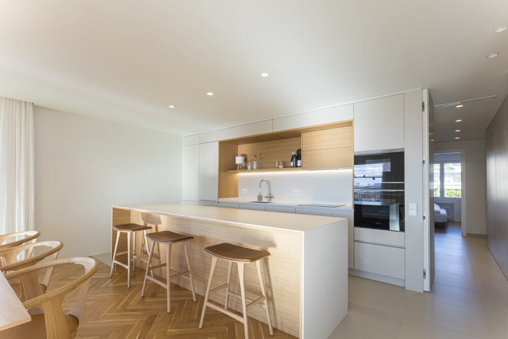 Upon entering, natural light floods every corner. The entrance opens into a spacious living-dining area that connects seamlessly with the terrace, creating a perfect harmony between indoor and outdoor spaces. The open-plan layout is complemented by contemporary furnishings, while the integrated kitchen combines functionality and design with clean lines and warm materials, inviting shared moments.