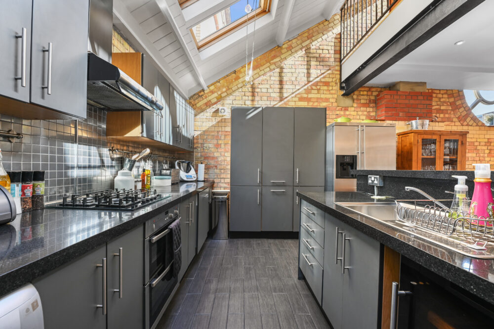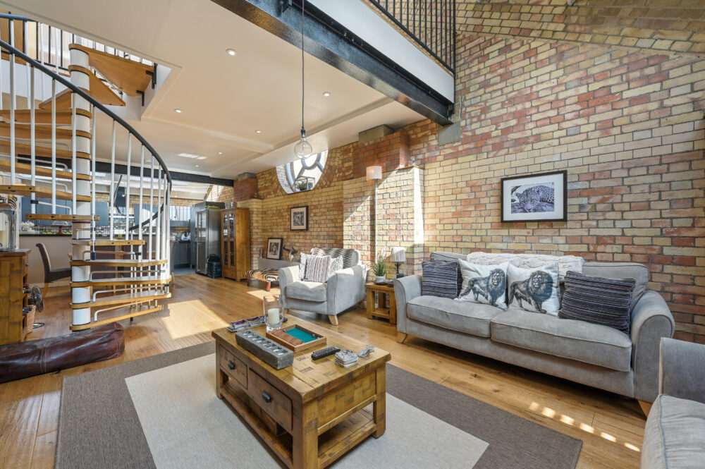 Spanning c.1,500 square feet, the accommodation comprises a grand kitchen, dining and living room with incredibly high ceilings and an abundance of natural light through the various windows. There is a spiral staircase that leads up to the mezzanine level, which creates an interesting space for a separate sitting room, bedroom or office.