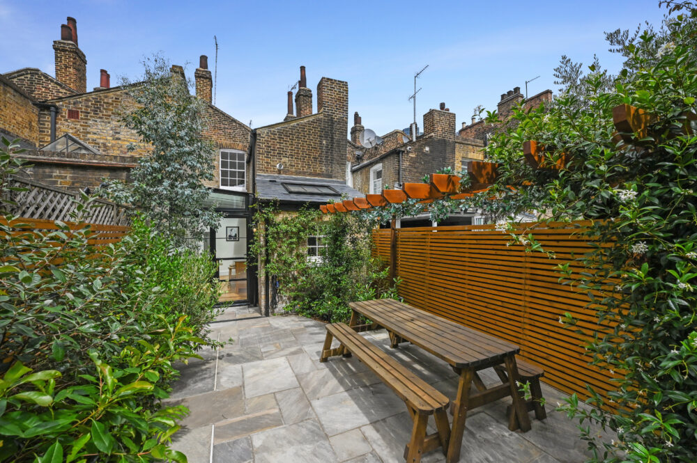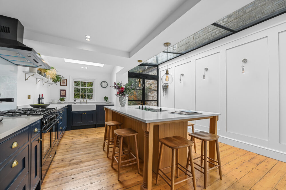 To the rear of the property lies a stylish, contemporary kitchen fitted with brand-new appliances and Bianco Carrara quartz worktops. A breakfast-style island with seating sits within an extended section of the home, framed by sleek modern Crittall-style glass doors and ceiling, which seamlessly lead out to a generously sized, thoughtfully landscaped south-facing garden, with a pergola area, perfect for relaxing or entertaining.
