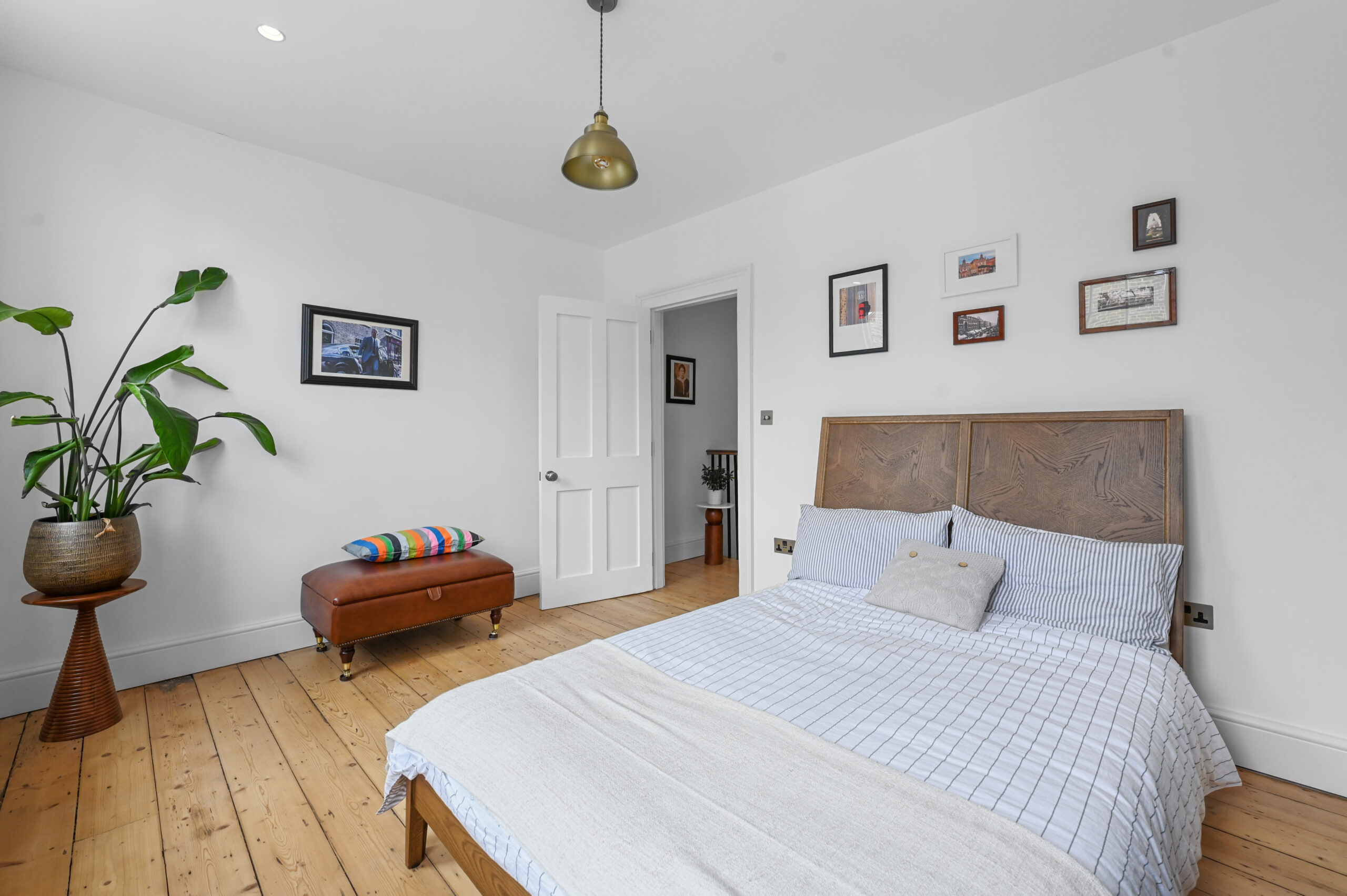 Upstairs, you’ll find two well-proportioned double bedrooms with additional built-in wardrobe space. The beautifully designed bathroom is a standout feature, complete with a striking dark red stainless steel bathtub, underfloor heating, a walk-in shower, and a vanity unit with a toilet, all accessed through a stunning original stained-glass door that adds a unique, historic touch.