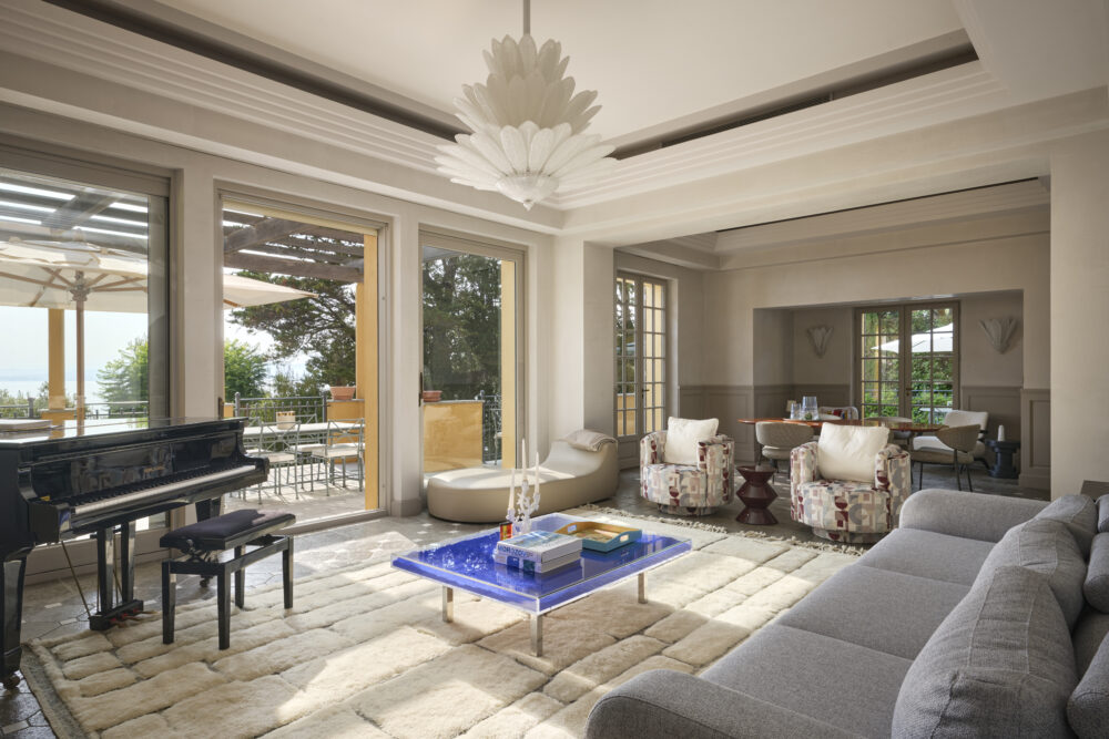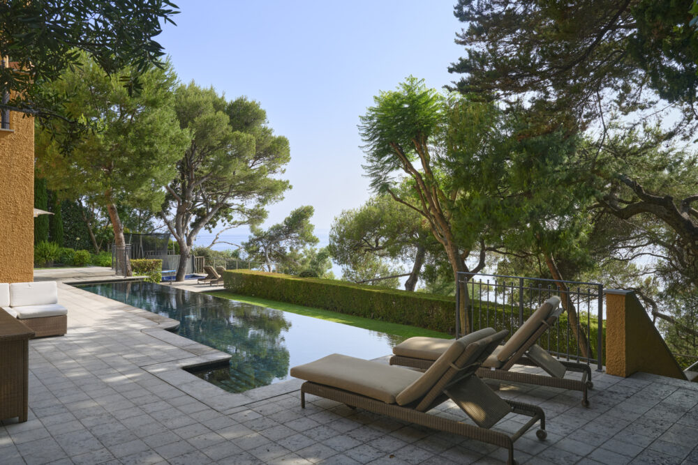 Inside, the living areas — reception room and dining room — open onto a vast panoramic terrace facing the sea, featuring elegant French natural stone floors. The five spacious bedrooms each have their own dressing room and en suite bathroom, enhanced by high-quality solid wood flooring.