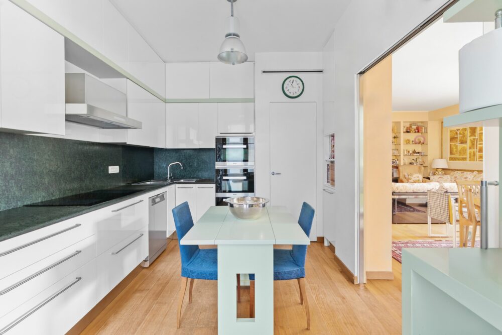 The property is completed by a cellar, large interconnecting mechanized garages, and shared ownership of the condominium fitness room.