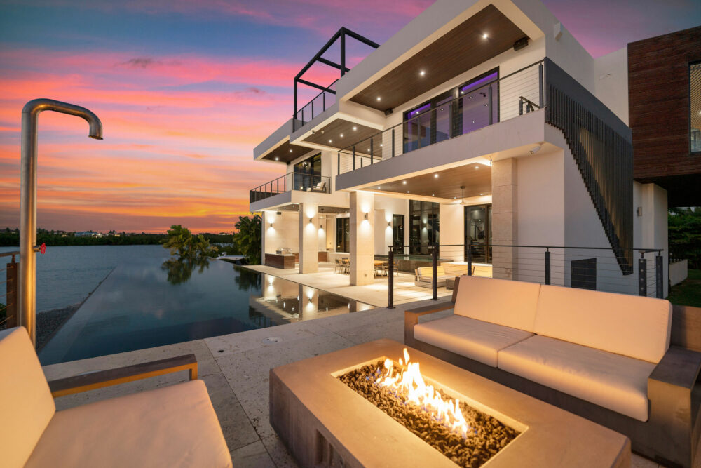 The outdoor kitchen sits on an expansive coral stone patio featuring a large seating area next to a shallow reflecting pool all shaded by the deep terraces extending from the bedroom and office above. Between these spaces sits the outdoor dining area which stands out for its dramatic 25-foot high ceiling, created by the terrace off the third floor gym. With a shallow reflecting pool on one side and the main pool, an impressively sized infinity edge beauty on the other, the outdoor dining area looks across their mirror like surfaces which by day reflect their surroundings and by night are lit by LED lights and accented by the flames of firepits. Featuring over 200 feet of water frontage, boaters will not be disappointed with the incredibly safe harbour inlet docking.