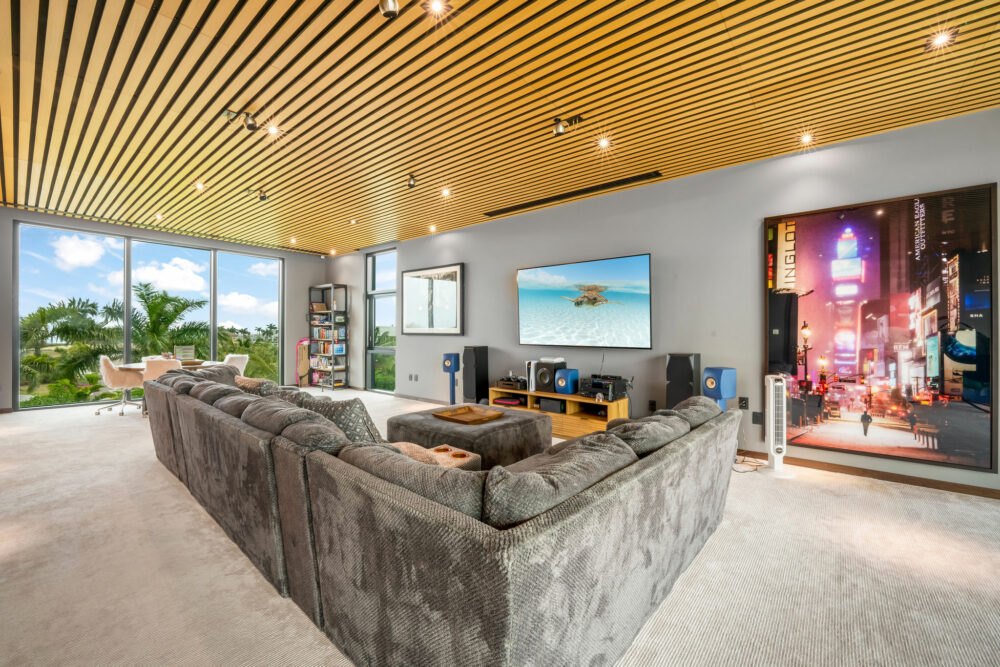 A generously sized main bedroom featuring a walnut wood wall adding warmth to the space is accompanied by a custom-built walk-in closet and an oversized and sleek main bathroom featuring an engineered stone freestanding bathtub. The children’s wing features bedrooms and a professional grade cinema, perfect for family viewing parties. A wing featuring beautifully appointed guest suites and a two bedroom staff apartment on the second level lead you up to a third level gym large enough to accommodate any desired equipment, this one featuring a treadmill, weights and a full sized snow ski simulator leading to another generous outdoor space and roof top firepit. In addition to all this the home boats a large, comfortable office with workstations, sofas and a tv as well as an enormous 1200 square foot game room big enough for a golf simulator and pool table with room to spare.