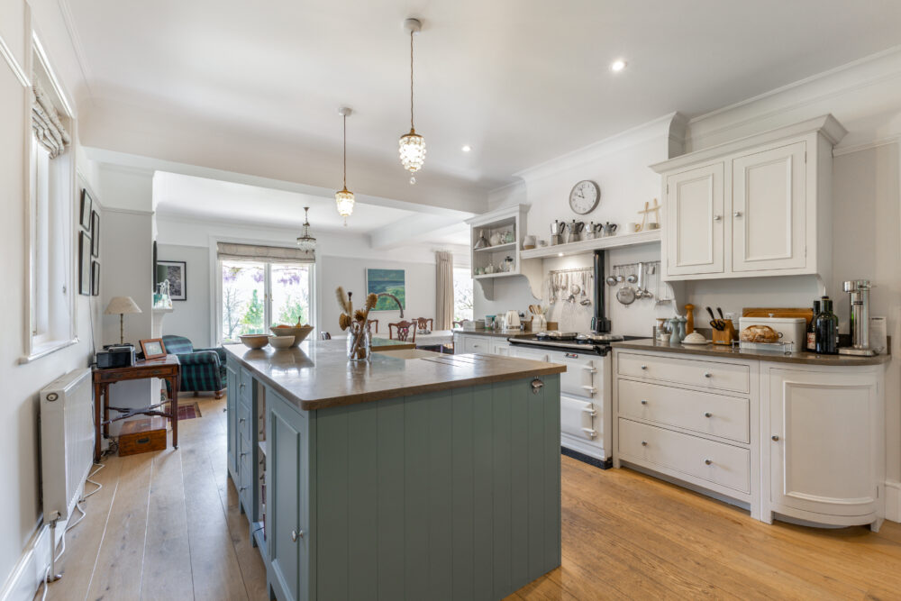 This substantial family house offers excellent accommodation and beautiful characterful features throughout. The wide and spacious entrance hall welcomes you warmly and features original exposed floorboards and unique panelling whilst providing access to all principal reception spaces. The kitchen is very much the heart of the home containing a comprehensive range of wall and floor mounted units, an Aga and a sociable central island with a butler sink. There are doors leading to a charming veranda adorned in Wisteria overlooking the gardens. On a practical level there is a very useful boot room, utility area and plenty storage cupboards as well as rear access to the terrace and garden, all essential for modern family life. The drawing room is a particular highlight and is impressive in its proportions featuring a window seat to enjoy the views over the garden and a wood burning stove for the cooler winter months. A study and a very cosy snug complete the ground floor accommodation