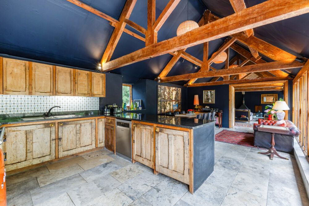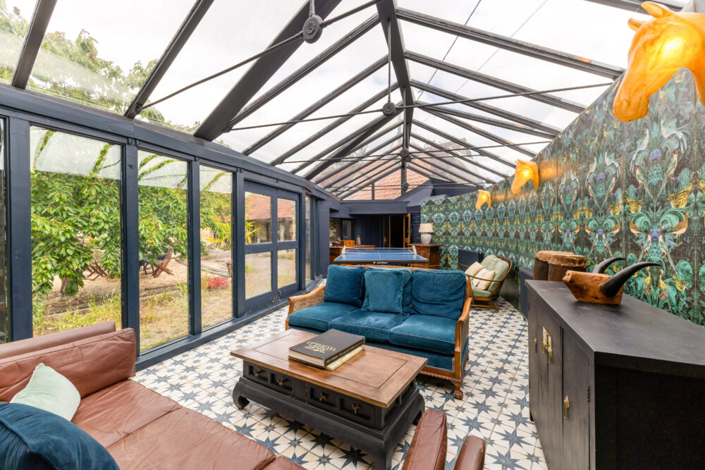 On entering the property there is a front to back entrance hall with easy access to the enclosed garden as well as the principal living area. This comprises of an open plan kitchen/diner and living room. The kitchen is well equipped and boasts an Aga cooker and is open plan to the living area, which has a feature wood burner. Both have double doors out to the garden as well as the whole space enjoying a vaulted ceiling with exposed beams. The living room also provides access to the family/garden room. This room provides a feature curved wall to one side and a glazed wall to the other with expansive views of the gardens. There is also a vaulted glazed roof affording light and a sense of space. Leading from here are the principal and guest bedrooms, which both enjoy tall ceilings and easy access to the gardens as well as the use of a spacious contemporary shower room.