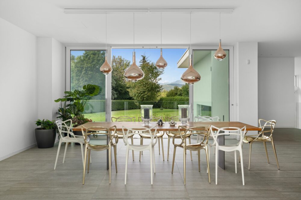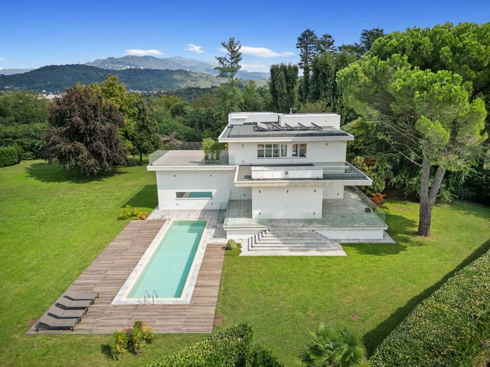 With minimalist absolute luxury finishes throughout, the outstanding interior space offers modern comfort, a well addressed layout, impressive volumes flooded in inviting natural light enhancing the connection with the sky and the evergreen well planted parkland. The main materials used are natural stone, white plaster, concrete and other high quality materials. The white interior follows through to the outside and inside of the villa, creating the perfect canvas oozing unobstructed balance within the areas. The internal area, over two floors and lower ground, is defined by its pure volumes and horizontal lines that contrast with the strong presence of the surrounding nature. Windows, terraces and skylights allow natural light to the different rooms amplified by the white colour of the walls and ceilings, and the light tone of the flooring.