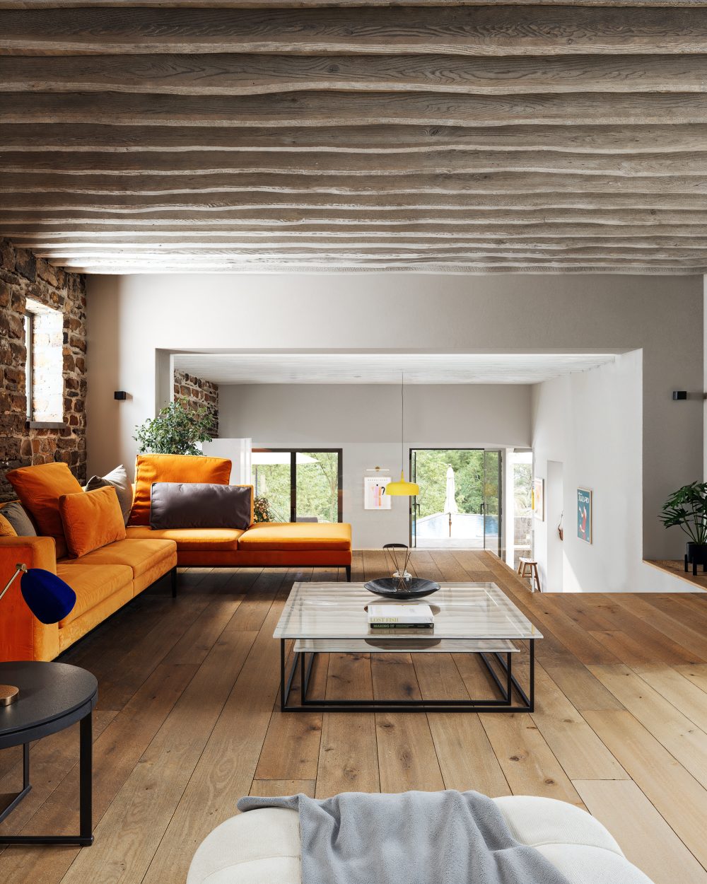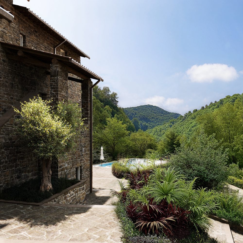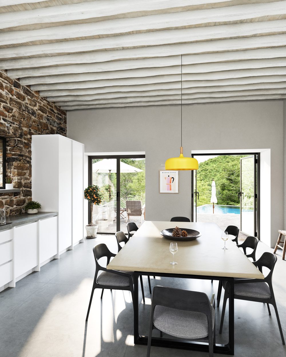 Traditional Tuscan features—original stone walls and exposed wooden beams—will be carefully retained. Beyond these elements, the internal design adopts a modern, stylish, and highly functional approach. The kitchen and dining area open directly onto an infinity pool with south- and west-facing views over the valley.