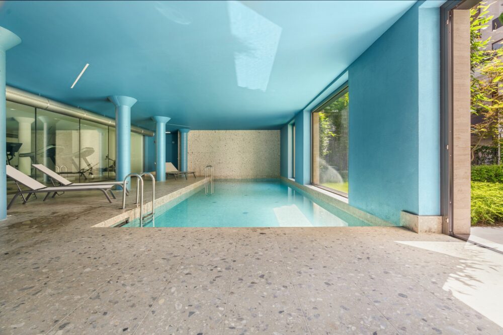 Residents of the Washington Building enjoy an exceptional range of exclusive amenities, including a spa, an indoor swimming pool, a fully equipped fitness area, a versatile lounge space, a dedicated delivery room, secure bicycle storage, and a three-level underground car park with ample parking and technical facilities. In terms of energy efficiency, the development achieves Class A4 certification, employing cutting-edge insulation techniques and renewable energy sources such as geothermal systems and photovoltaic panels.