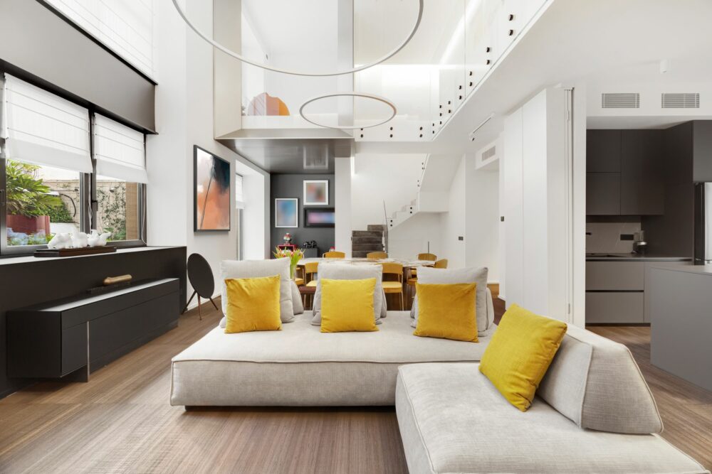 Among the standout properties available there is this exquisite multi-level apartment that flawlessly integrates comfort and design. The lower floor is dedicated to an expansive living area, featuring soaring ceilings, premium materials, and a private terrace adorned with manicured greenery, creating an idyllic extension of the home. The upper level is reserved for the sleeping quarters, ensuring maximum privacy while exuding an atmosphere of refinement and tranquillity.