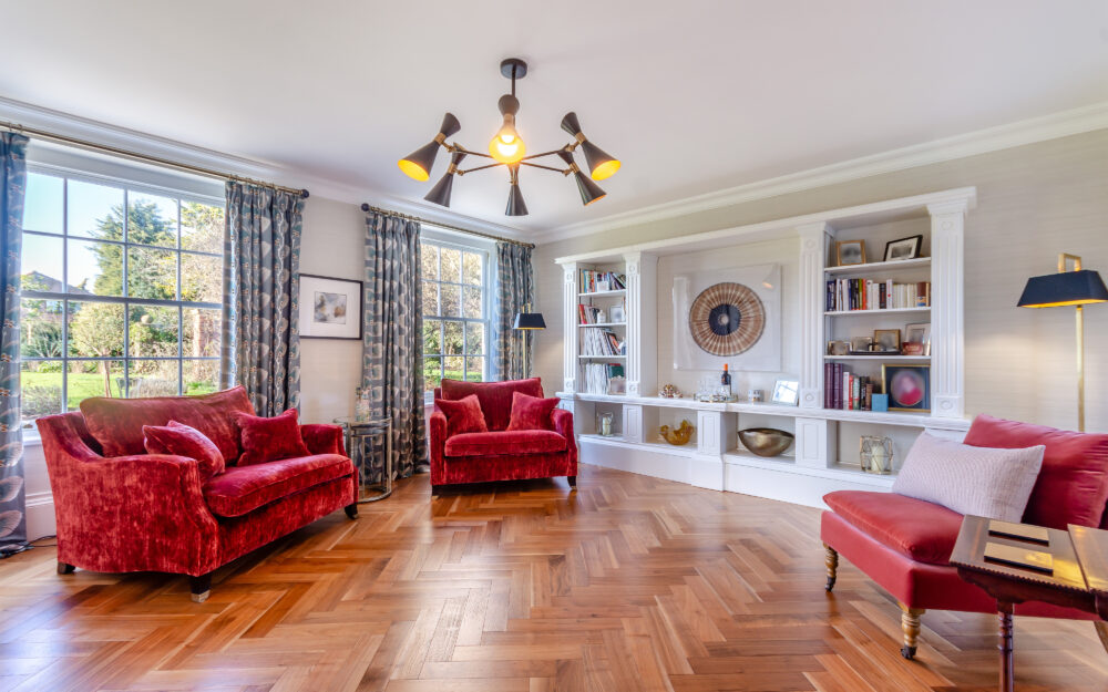 Library/family room, two sash windows to the side elevations, two radiators and a feature herringbone wood block parquet floor.