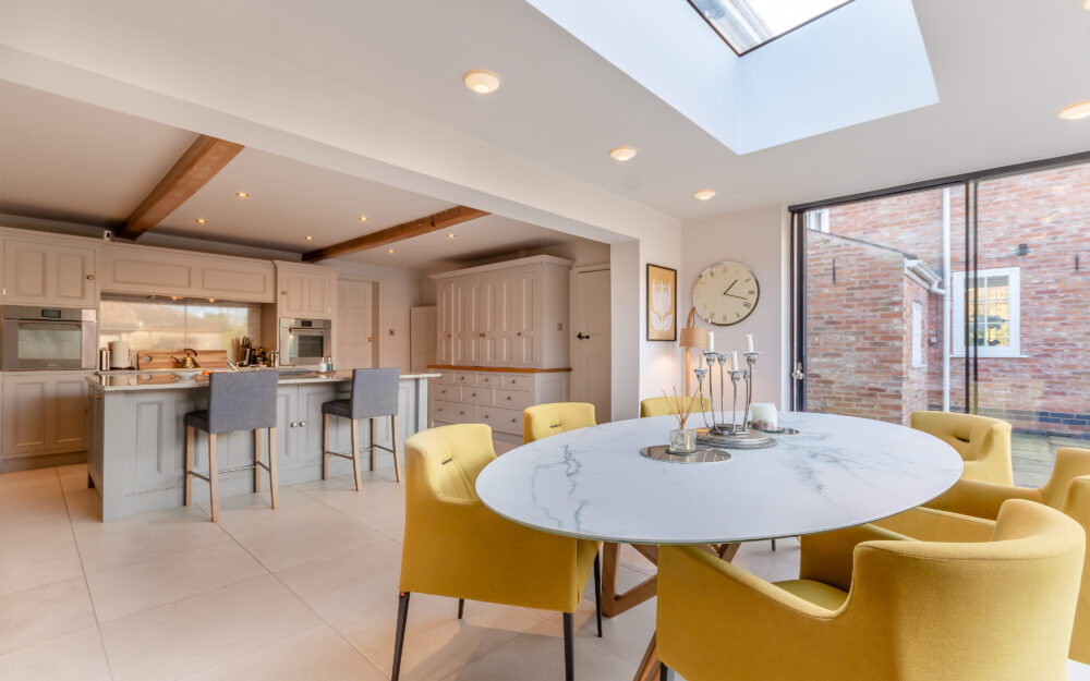 Open plan living / dining kitchen, a bespoke fitted kitchen by Hill Farm Kitchens, comprising base and wall units with stone work surfaces, incorporating induction hob, cooker hood above, stone splashbacks, two electric ovens, pantry style cupboard, feature island unit incorporating sink unit, breakfast bar, integrated dishwasher and fridge. Exposed beams, feature Inglenook fireplace with log burner and tiled flooring with underfloor heating. Opening through to the living area/garden room, a recent addition to the property with sliding double glazed doors to the rear, skylight and access to the rear porch.